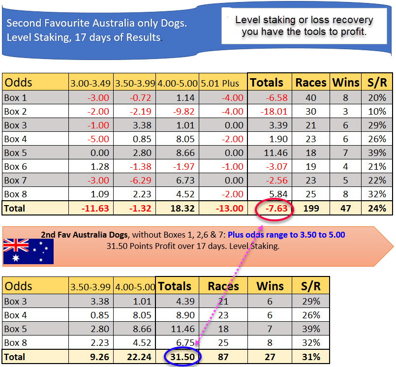 Example only. 2nd Fav, odds 3.00 to 5.00, but fav must be between 2.20 and 3.50, in races 285 to 780, all classes, all traps, UK