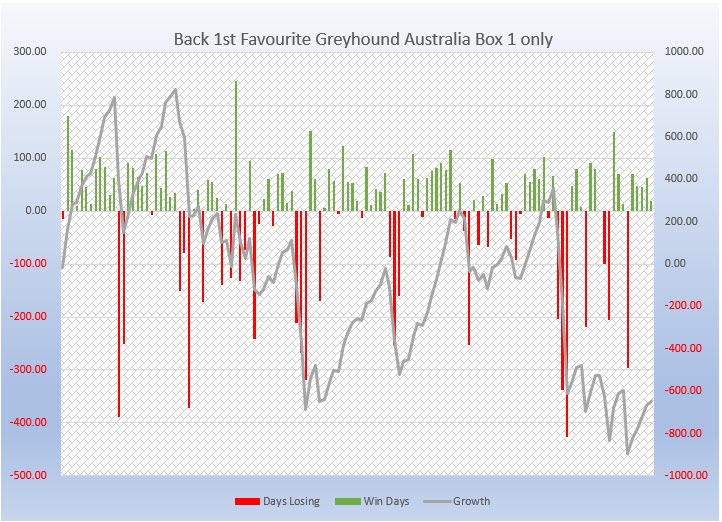 Example only. 1st Fav, odds 2.20 to 5.00, all distances, all traps/boxes, Australia/NZ